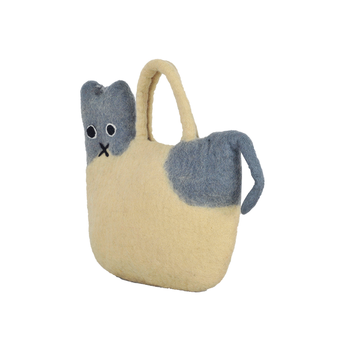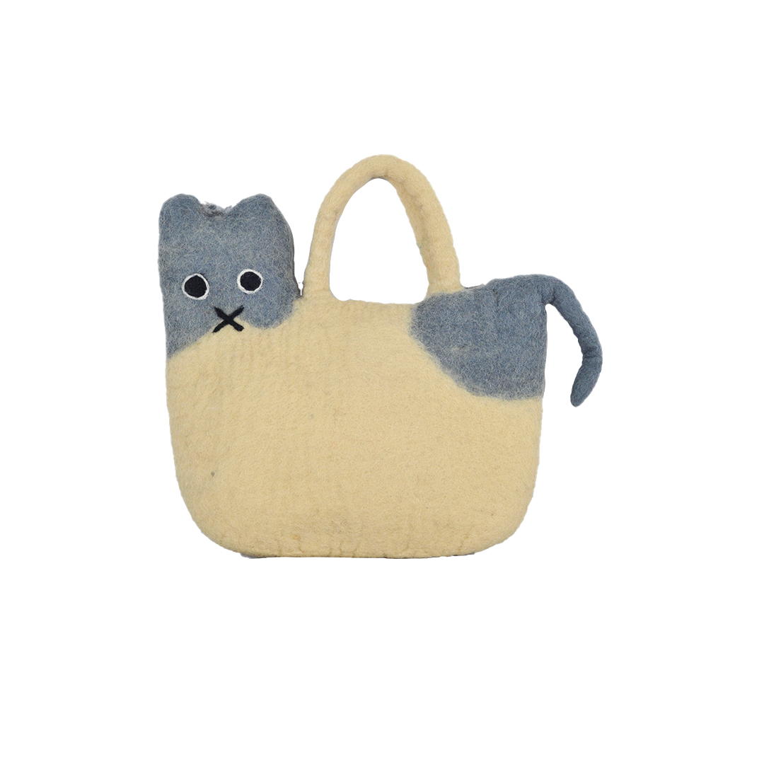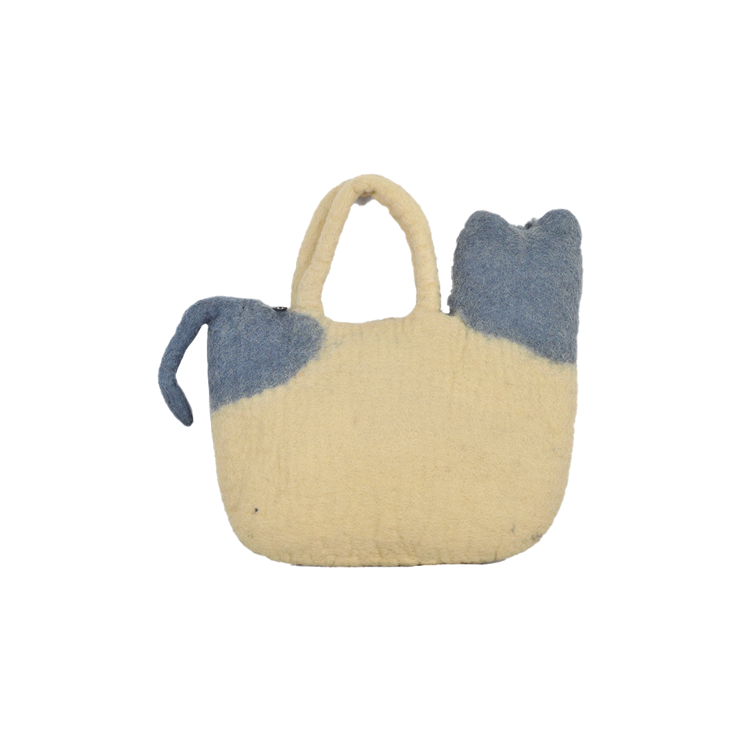 This is a felt cat purse. It is made of felt and has a cute cat design. The body of the cat is a cream color, while the head, tail, and a spot on the side are a muted blue color. The cat’s face features are simple – two black dots for eyes and an “x” shaped stitch for a nose. It is perfect for carrying small items like keys, coins, or makeup. It is also a great gift for cat lovers.