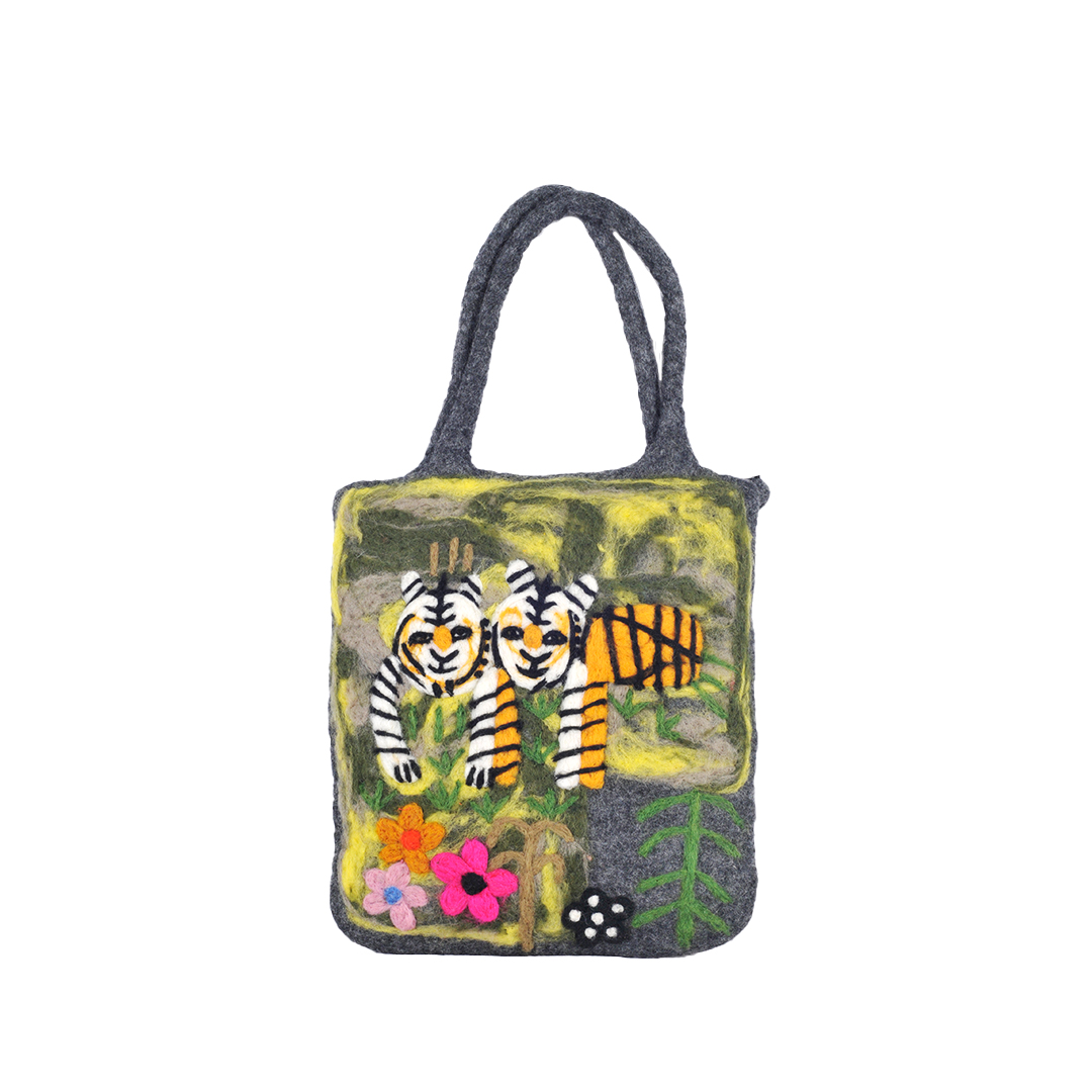 Embark on a wild adventure with the Jungle Companions Felt Purse, a lively accessory that brings the vibrant energy of the jungle to your everyday life. This delightful tote features two playful tigers, hand-felted with intricate detail against a lush, green backdrop. Perfect for animal lovers and those with a free spirit, this bag combines functionality with a touch of exotic flair.